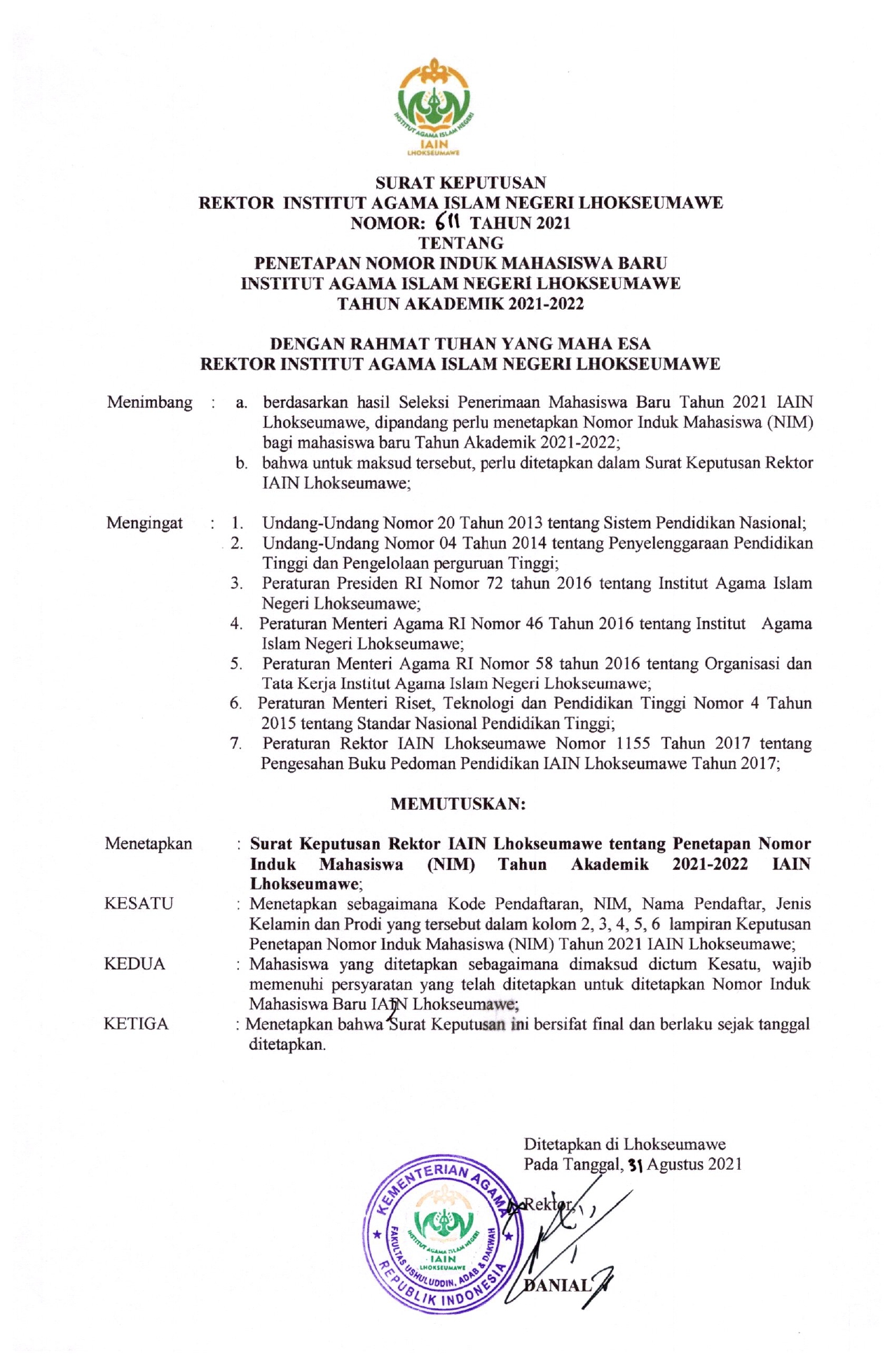 Penetapan Nomor Induk Mahasiswa Baru (NIM) Mahasiswa Baru IAIN Lhokseumawe T.A 2021/2022