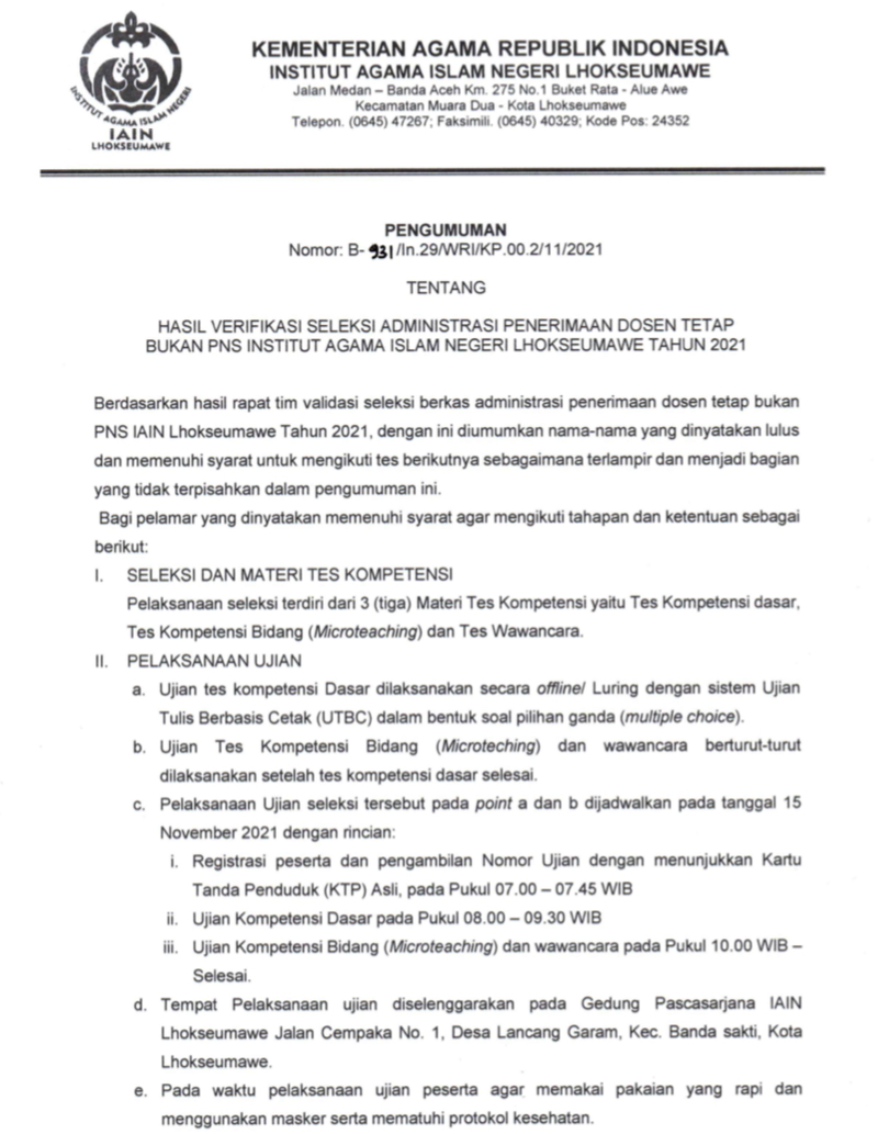 Pengumuman : Hasil Verifikasi Administrasi Penerimaan Dosen Tetap Bukan PNS IAIN Lhokseumawe 2021