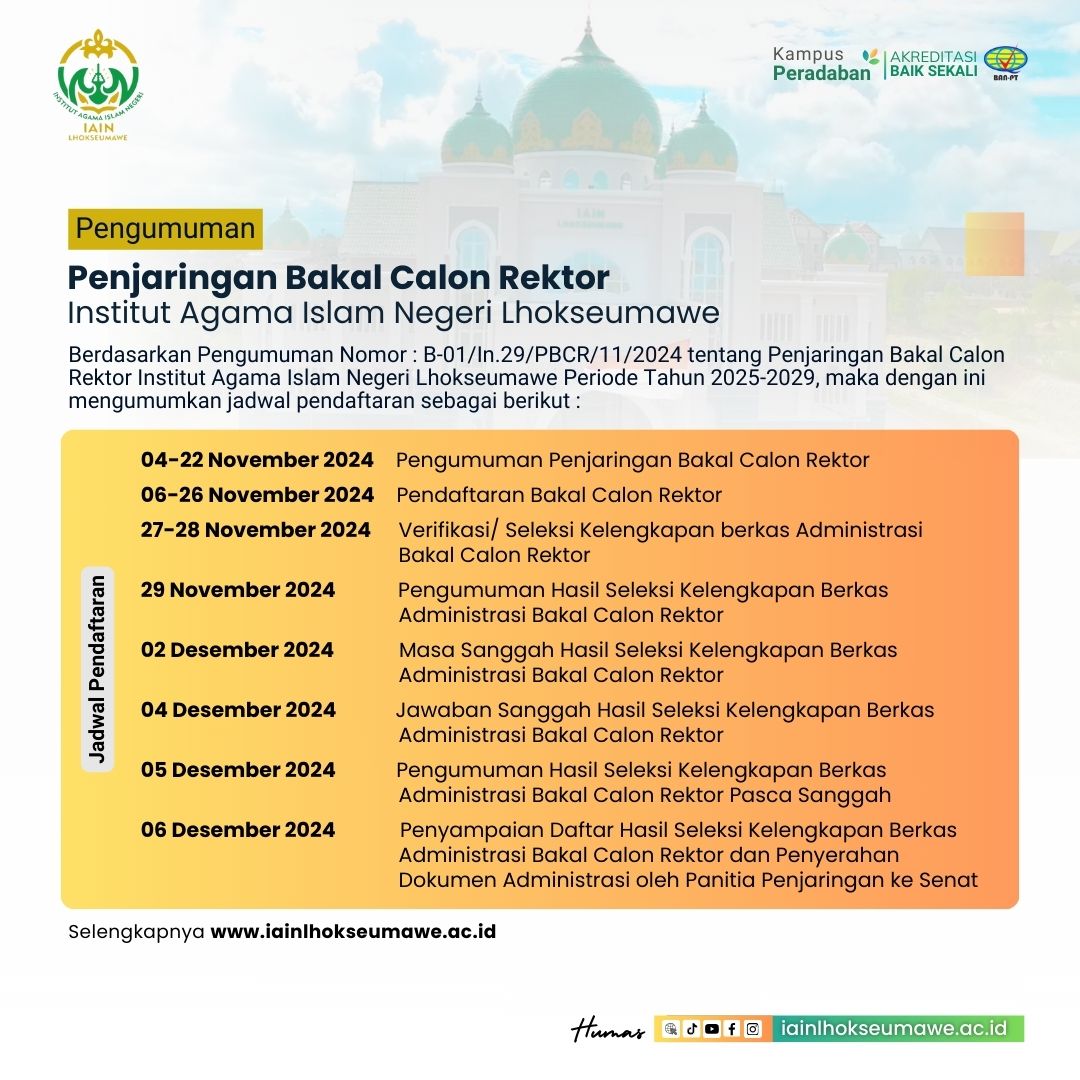 Institut Agama Islam Negeri Lhokseumawe memberikan kesempatan kepada Dosen dari seluruh Perguruan Tinggi di Indonesia untuk mengikuti Penjaringan Bakal Calon Rektor IAIN Lhokseumawe Periode Tahun 2025-2029 dengan ketentuan jadwal sebagai berikut;