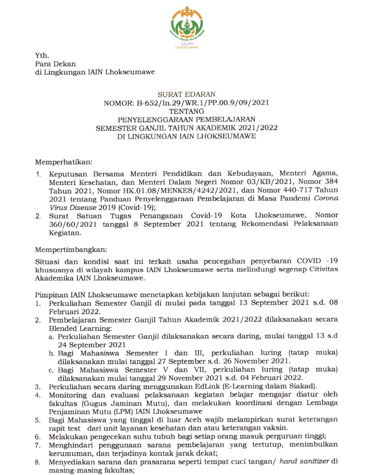 Surat Edaran : Penyelenggaraan Pembelajaran Semester Ganjil T.A 2021/2022 IAIN Lhokseumawe